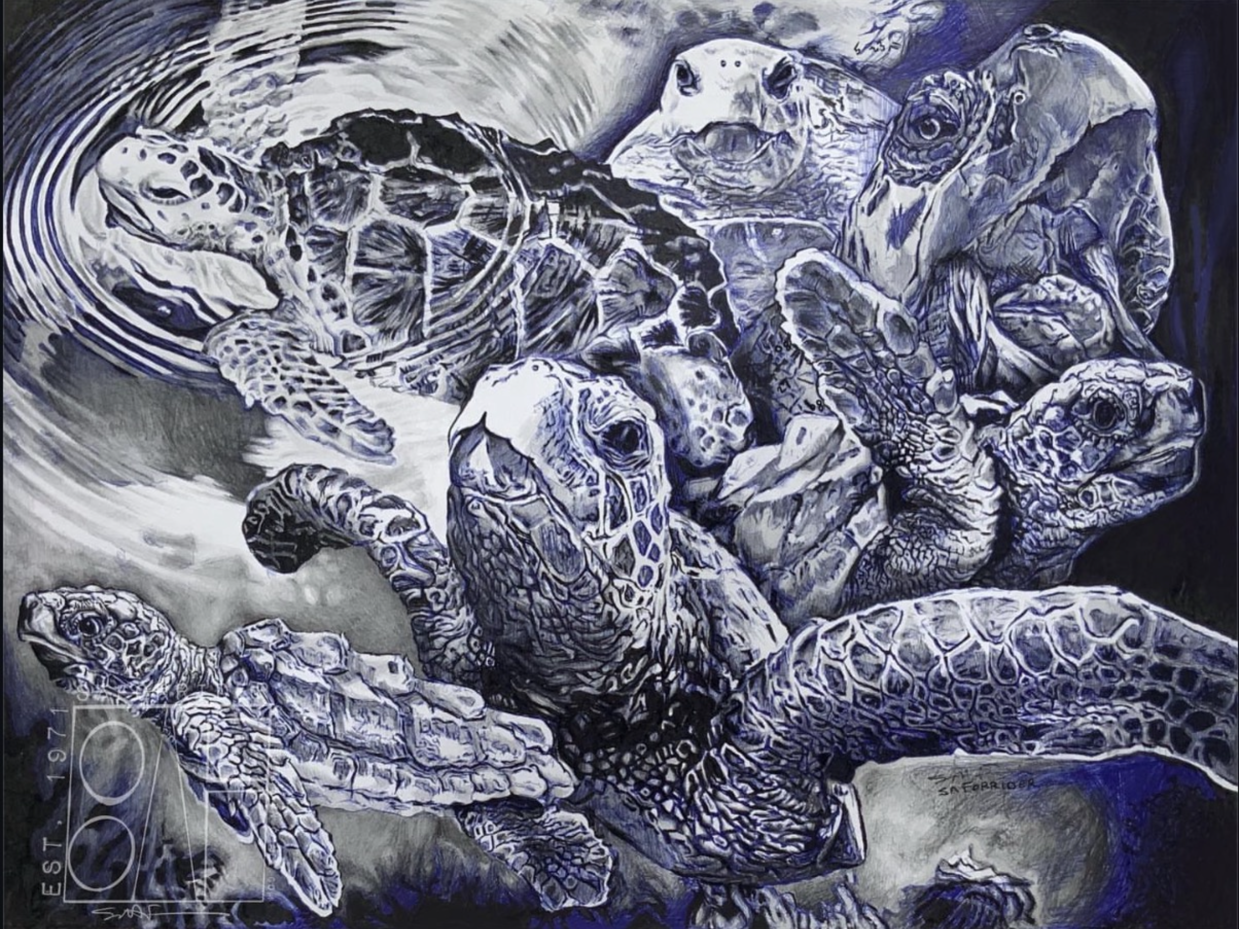Loggerhead sea turtles face mounting threats from coastal development, fishing gear, and pollution. This graphite composition brings together multiple stages of their life cycle, honoring a species whose ancient journey through the oceans is increasingly fragile.